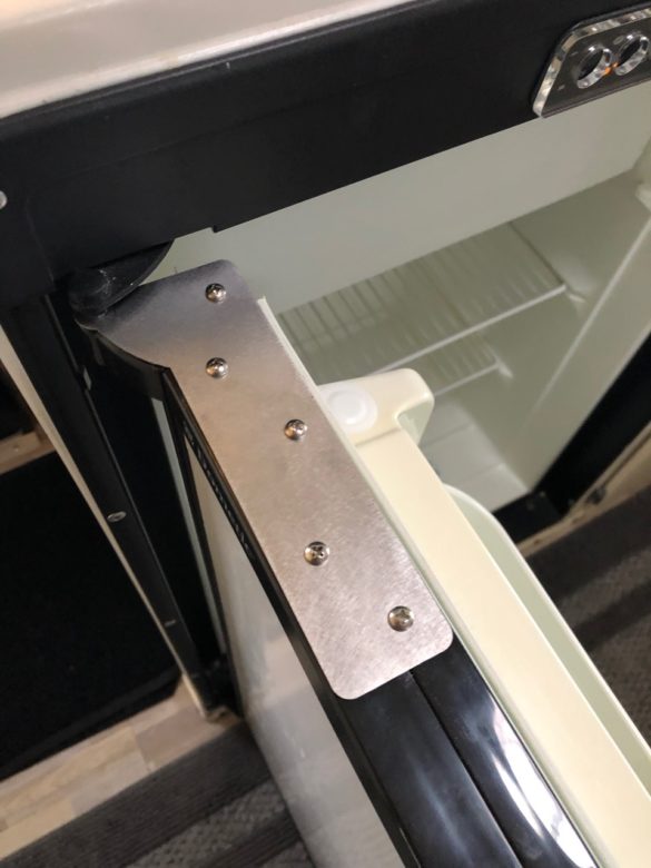 The Dometic fridge in the 17′ Casita has a weak plastic hinge. Â It can break if it pops open in transit, is overloaded, or by leaning on it while open. Â Replacing the hinge required a costly new door from Dometic until Little House Customs came to the rescue with a stainless steel reinforcement plate that will help prevent the hinge from breaking. Â It will also fix a broken hinge.